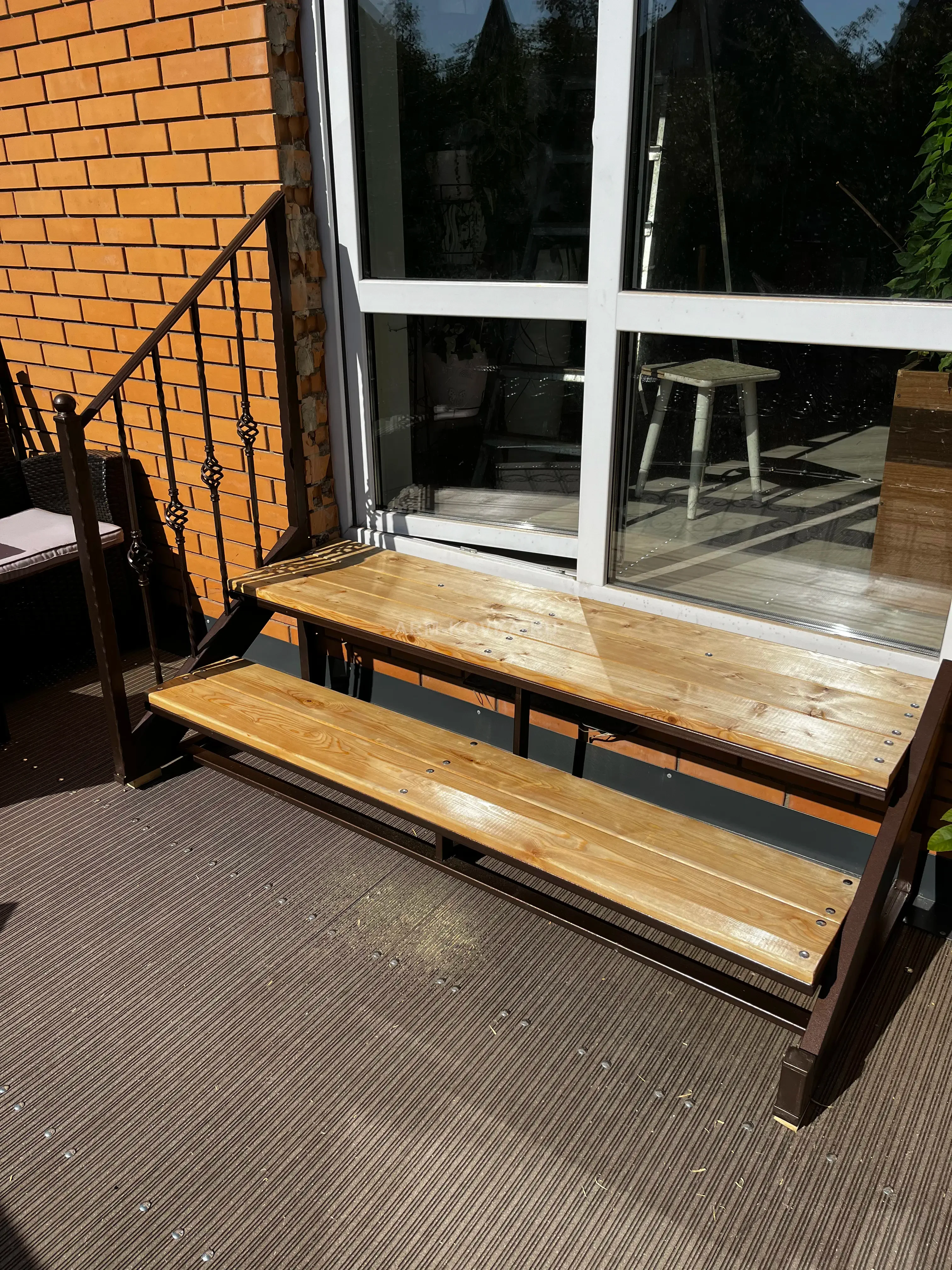 Компактная и функциональная лестничная конструкция на металлокаркасе, предназначенная для выхода на террасу или во внутренний двор. Основание выполнено из прочного металлического профиля, окрашенного в глубокий шоколадный цвет, что обеспечивает устойчивость к погодным условиям. Ступени изготовлены из натурального дерева с защитным лаковым покрытием, подчеркивающим природную текстуру и создающим уютный контраст с темным металлом. Безопасность подъема обеспечивает лаконичное боковое ограждение, состоящее из вертикальных стоек с декоративными коваными «корзинками». Такая конструкция идеально вписывается в архитектуру современного загородного дома, гармонируя с кирпичной кладкой стен и напольным покрытием из террасной доски.