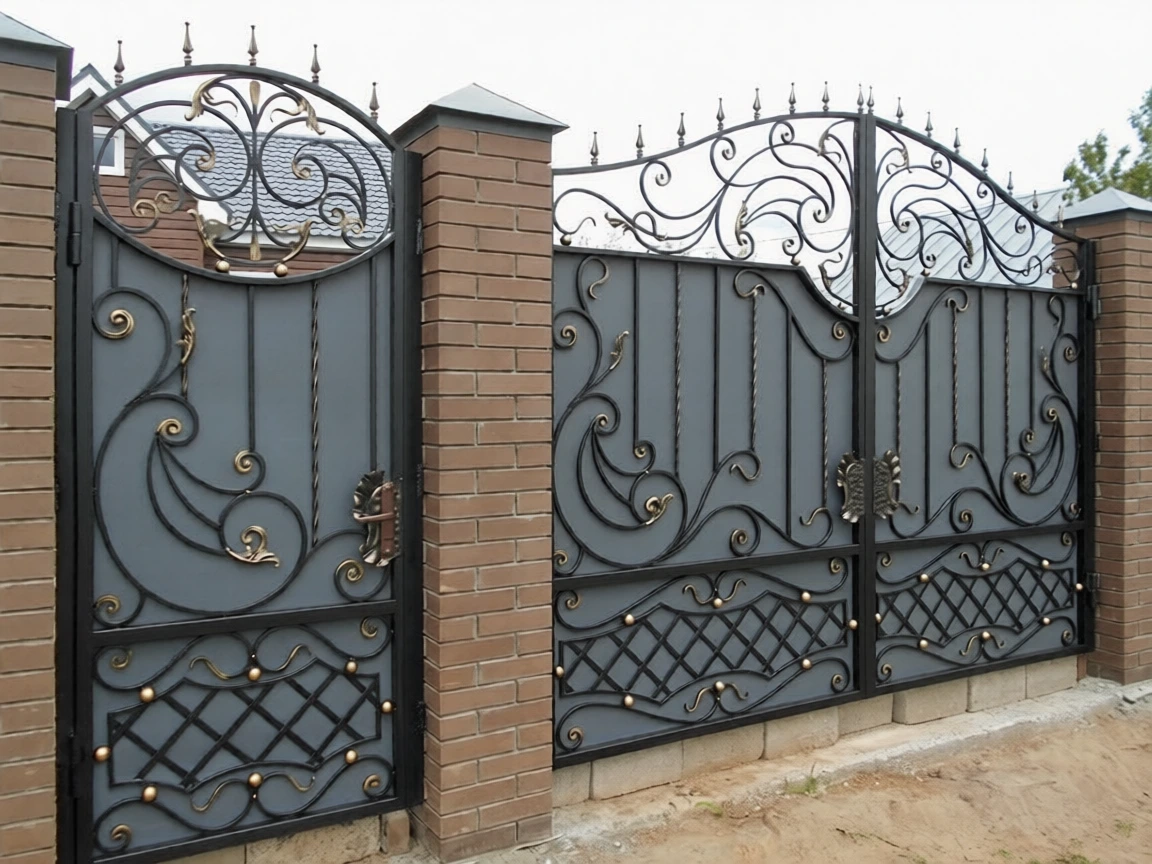 Распашные или откатные кованые ворота с художественными элементами. Стоимость указана за ворота стандартного размера (3×2 м) с учётом материала, изготовления, покраски и патинирования. Более 10 вариантов цветов. Установка под ключ в Истре и Истринском районе. Возможна зашивка листом, поликарбонатом или профлистом.