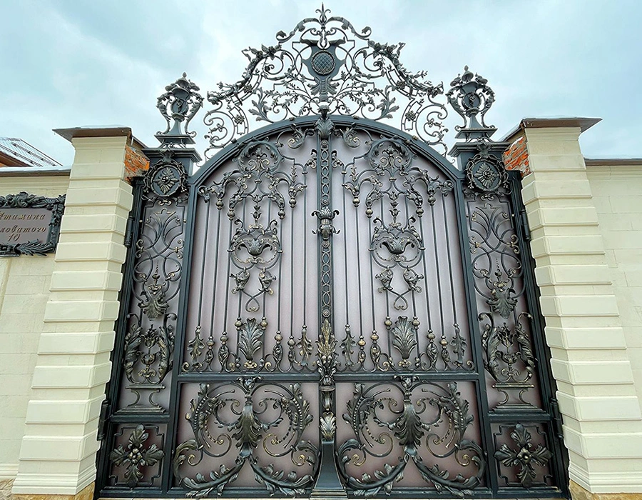 Представительские кованые ворота с максимально богатым художественным оформлением. Изысканный ручной узор, пики и завитки по всей конструкции. Идеальны для загородных резиденций. Изготовление и установка под ключ в Истринском районе.