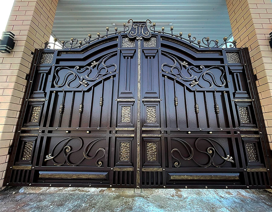 Кованые ворота с крупным центральным медальоном и развитым орнаментом. Авторский дизайн, усиленная рама из профильной трубы. Антикоррозийное покрытие, возможна автоматизация. Установка в Истре и Истринском районе.